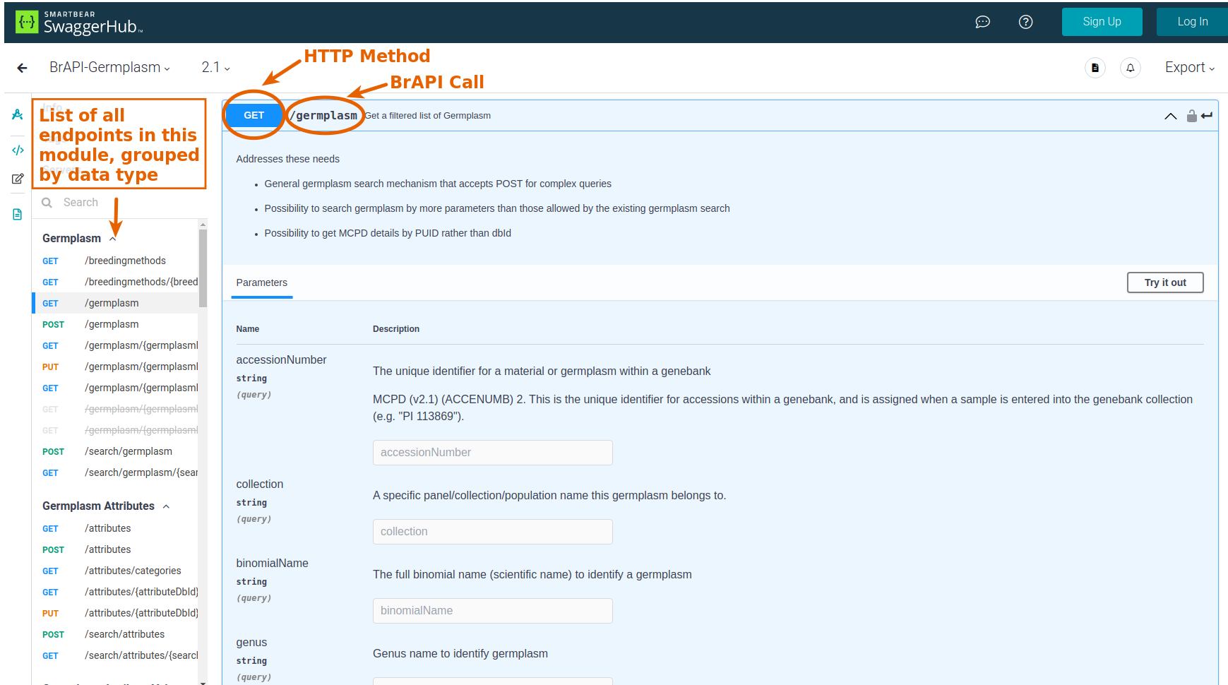 - BrAPI-Germplasm: contains endpoints related to germplasm, crosses, seedlots, pedigrees.